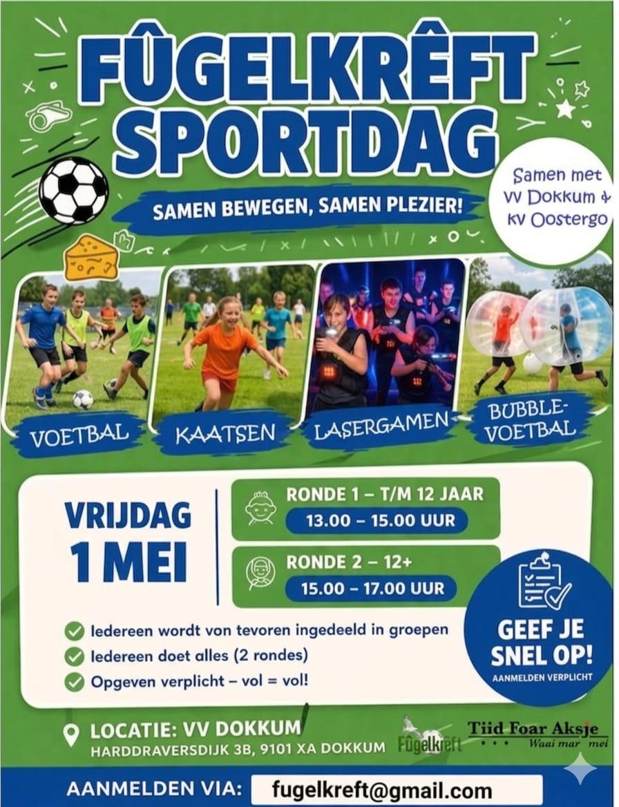 FûgelKrêft Sportdag – Vrijdag 1 mei 2026 april 18, 2026 FûgelKrêft Sportdag – Vrijdag 1 mei 2026 Dit delen:FacebookXVind ik leuk:Vind-ik-leuk Laden... Share via: Facebook Twitter LinkedIn More